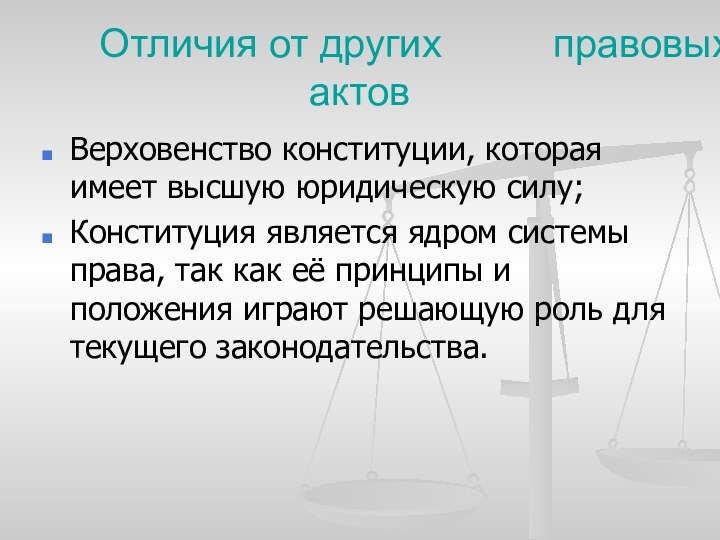 Верховенство конституции, которая имеет высшую юридическую силу;