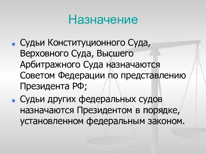 судов назначаются Президентом в порядке, установленном федеральным законом.