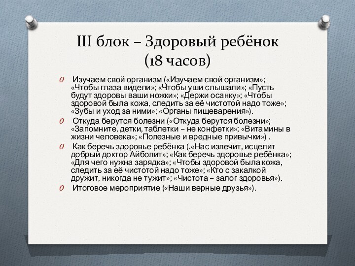 слышали»; «Пусть будут здоровы ваши ножки»; «Держи осанку»; «Чтобы здоровой была кожа, следить за её чистотой надо тоже»; «Зубы и уход за ними»; «Органы пищеварения»).