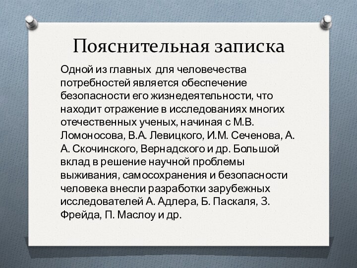 многих отечественных ученых, начиная с М.В. Ломоносова, В.А. Левицкого, И.М. Сеченова, А.А. Скочинского, Вернадского и др. Большой вклад в решение научной проблемы выживания, самосохранения и безопасности человека внесли разработки зарубежных исследователей А. Адлера, Б. Паскаля, 3. Фрейда, П. Маслоу и др.