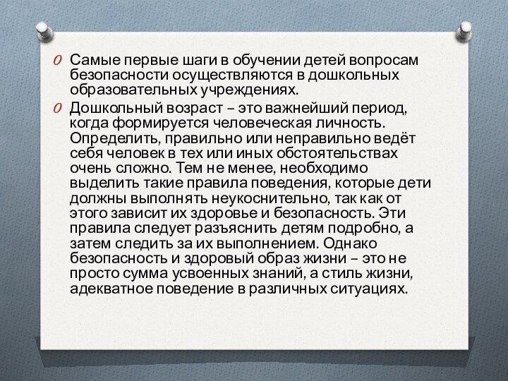 период, когда формируется человеческая личность. Определить, правильно или неправильно ведёт себя человек в тех или иных обстоятельствах очень сложно. Тем не менее, необходимо выделить такие правила поведения, которые дети должны выполнять неукоснительно, так как от этого зависит их здоровье и безопасность. Эти правила следует разъяснить детям подробно, а затем следить за их выполнением. Однако безопасность и здоровый образ жизни – это не просто сумма усвоенных знаний, а стиль жизни, адекватное поведение в различных ситуациях.