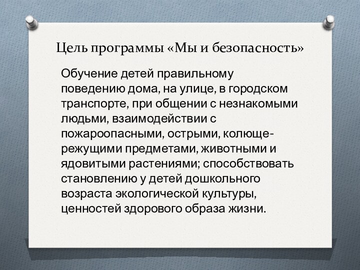 незнакомыми людьми, взаимодействии с пожароопасными, острыми, колюще-режущими предметами, животными и ядовитыми растениями; способствовать становлению у детей дошкольного возраста экологической культуры, ценностей здорового образа жизни.