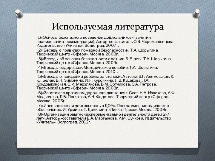 3)«Беседы об основах безопасности с детьми 5-8 лет». Т.А. Шорыгина. Творческий центр «Сфера». Москва. 2009г.