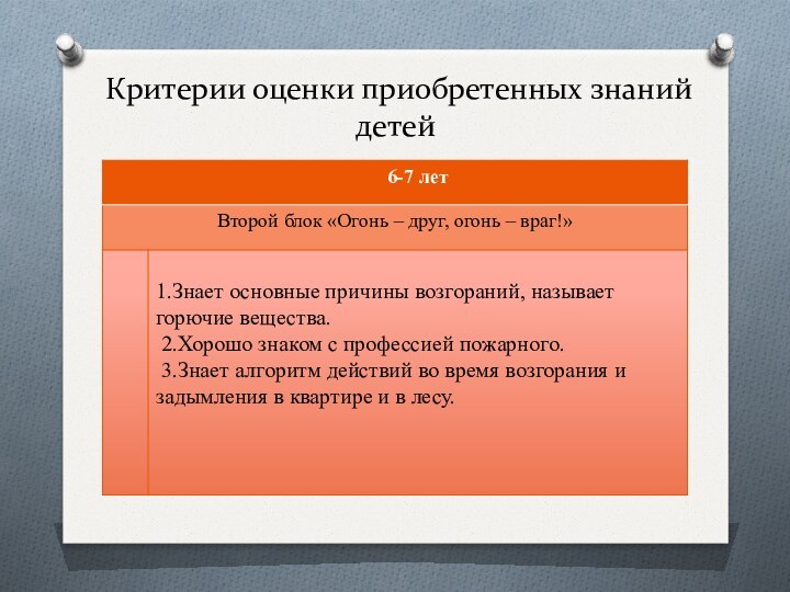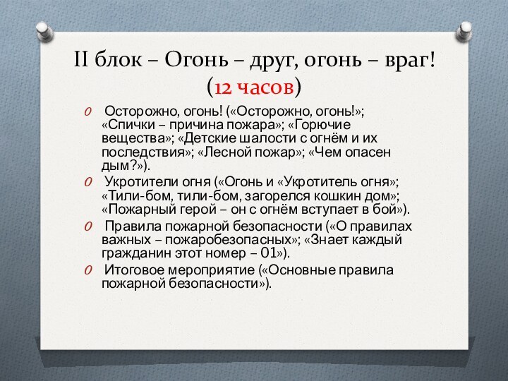 причина пожара»; «Горючие вещества»; «Детские шалости с огнём и их последствия»; «Лесной пожар»; «Чем опасен дым?»).