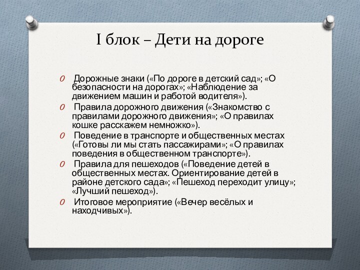 Правила для пешеходов («Поведение детей в общественных местах. Ориентирование детей в районе детского сада»; «Пешеход переходит улицу»; «Лучший пешеход»).