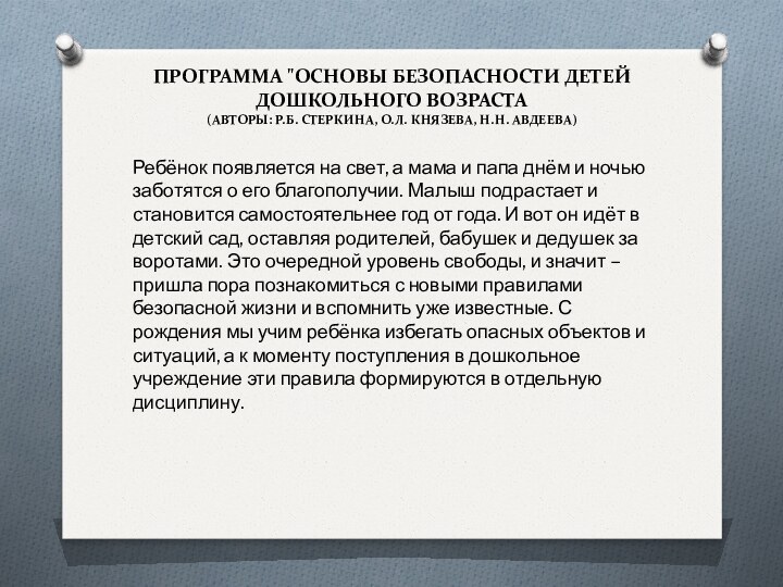 ПРОГРАММА "ОСНОВЫ БЕЗОПАСНОСТИ ДЕТЕЙ ДОШКОЛЬНОГО ВОЗРАСТА