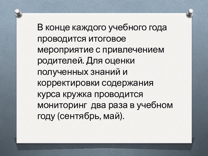 содержания курса кружка проводится мониторинг два раза в учебном году (сентябрь, май).