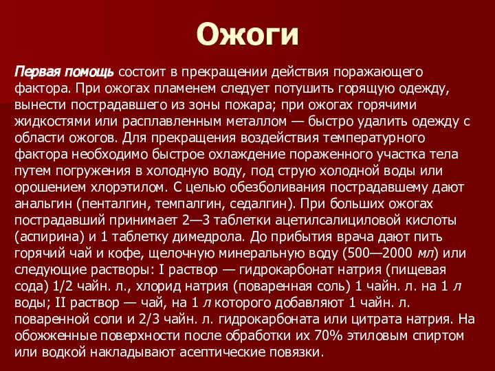 из зоны пожара; при ожогах горячими жидкостями или расплавленным металлом — быстро удалить одежду с области ожогов. Для прекращения воздействия температурного фактора необходимо быстрое охлаждение пораженного участка тела путем погружения в холодную воду, под струю холодной воды или орошением хлорэтилом. С целью обезболивания пострадавшему дают анальгин (пенталгин, темпалгин, седалгин). При больших ожогах пострадавший принимает 2—3 таблетки ацетилсалициловой кислоты (аспирина) и 1 таблетку димедрола. До прибытия врача дают пить горячий чай и кофе, щелочную минеральную воду (500—2000 мл) или следующие растворы: I раствор — гидрокарбонат натрия (пищевая сода) 1/2 чайн. л., хлорид натрия (поваренная соль) 1 чайн. л. на 1 л воды; II раствор — чай, на 1 л которого добавляют 1 чайн. л. поваренной соли и 2/3 чайн. л. гидрокарбоната или цитрата натрия. На обожженные поверхности после обработки их 70% этиловым спиртом или водкой накладывают асептические повязки.