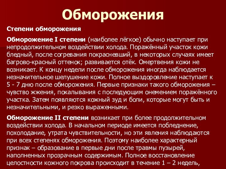 согревания покрасневший, в некоторых случаях имеет багрово-красный оттенок; развивается отёк. Омертвения кожи не возникает. К концу недели после обморожения иногда наблюдается незначительное шелушение кожи. Полное выздоровление наступает к 5 - 7 дню после обморожения. Первые признаки такого обморожения – чувство жжения, покалывания с последующим онемением поражённого участка. Затем появляются кожный зуд и боли, которые могут быть и незначительными, и резко выраженными.