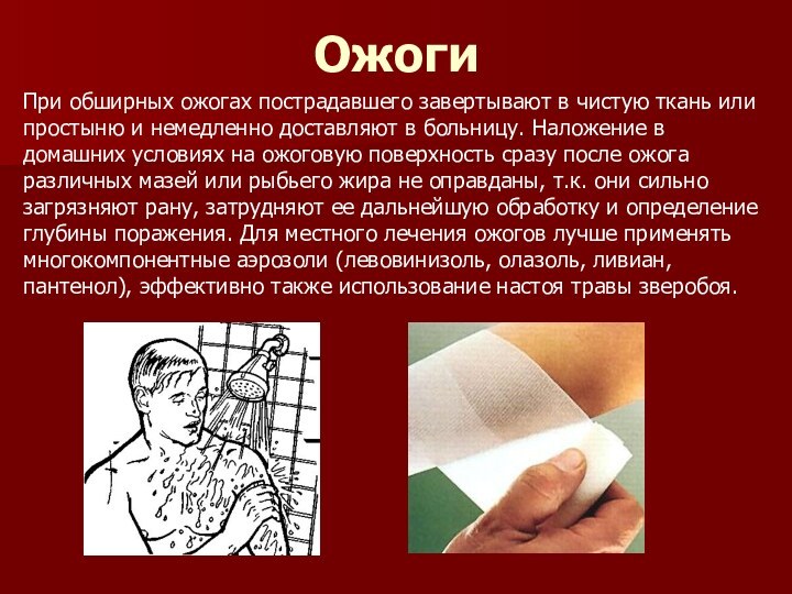 При обширных ожогах пострадавшего завертывают в чистую ткань