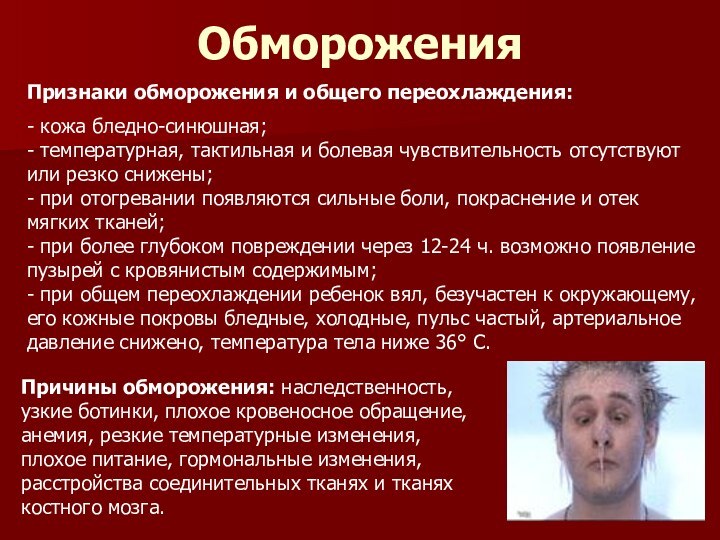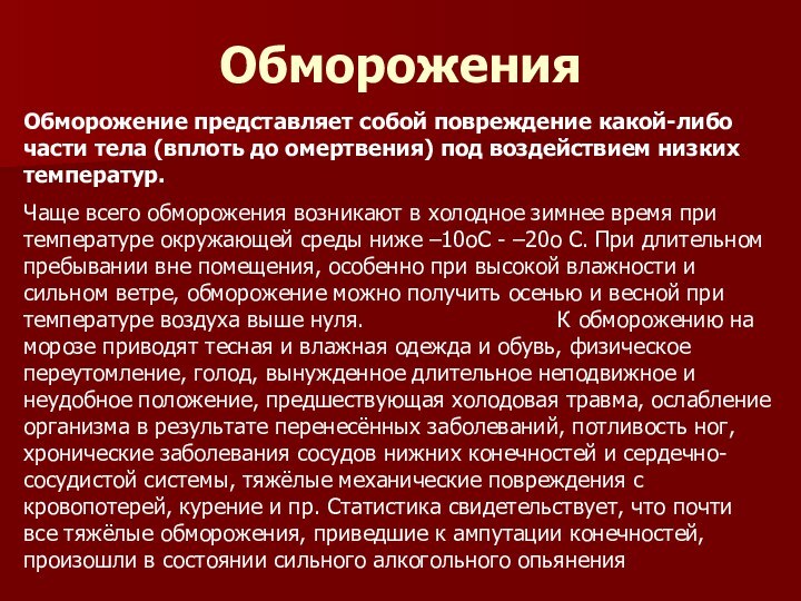 в холодное зимнее время при температуре окружающей среды ниже –10oС - –20o С. При длительном пребывании вне помещения, особенно при высокой влажности и сильном ветре, обморожение можно получить осенью и весной при температуре воздуха выше нуля. К обморожению на морозе приводят тесная и влажная одежда и обувь, физическое переутомление, голод, вынужденное длительное неподвижное и неудобное положение, предшествующая холодовая травма, ослабление организма в результате перенесённых заболеваний, потливость ног, хронические заболевания сосудов нижних конечностей и сердечно-сосудистой системы, тяжёлые механические повреждения с кровопотерей, курение и пр. Статистика свидетельствует, что почти все тяжёлые обморожения, приведшие к ампутации конечностей, произошли в состоянии сильного алкогольного опьянения