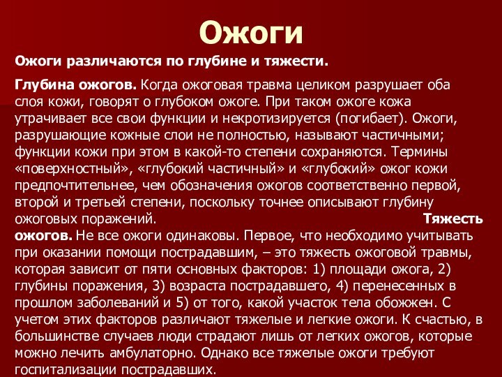 глубиной повреждения тканей. Чем больше площадь и глубже повреждение тканей, тем тяжелее течение ожога.