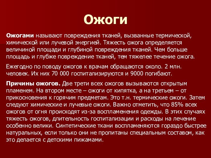 Причины ожогов. Две трети всех ожогов вызываются открытым пламенем. На втором месте – ожоги от кипятка, а на третьем – от прикосновения к горячим предметам. Это т.н. термические ожоги. Затем следуют химические и лучевые ожоги. Важно отметить, что 85% всех ожогов от огня происходят из-за воспламенения одежды. В этих случаях тяжесть ожогов, длительность госпитализации и расходы на лечение особенно велики. Синтетические ткани воспламеняются гораздо быстрее натуральных, если только они не пропитаны специальным составом, как это делается с детскими пижамами.