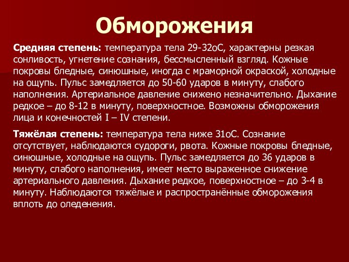 с мраморной окраской, холодные на ощупь. Пульс замедляется до 50-60 ударов в минуту, слабого наполнения. Артериальное давление снижено незначительно. Дыхание редкое – до 8-12 в минуту, поверхностное. Возможны обморожения лица и конечностей I – IV степени.