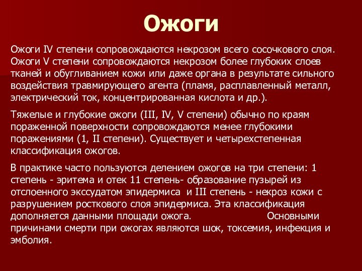 Тяжелые и глубокие ожоги (III, IV, V степени) обычно по краям пораженной поверхности сопровождаются менее глубокими поражениями (1, II степени). Существует и четырехстепенная классификация ожогов.
