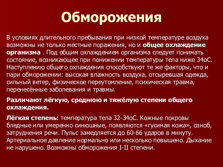 организма . Под общим охлаждением организма следует понимать состояние, возникающее при понижении температуры тела ниже 34oС. Наступлению общего охлаждения способствуют те же факторы, что и пари обморожении: высокая влажность воздуха, отсыревшая одежда, сильный ветер, физическое переутомление, психическая травма, перенесённые заболевания и травмы.