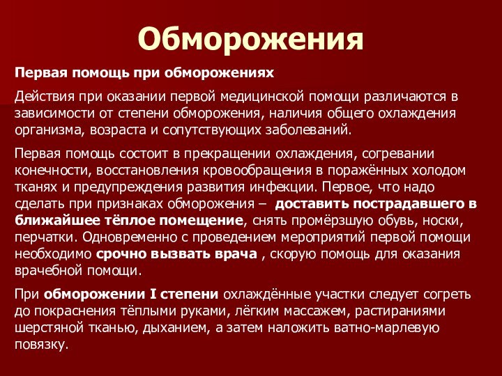 различаются в зависимости от степени обморожения, наличия общего охлаждения организма,