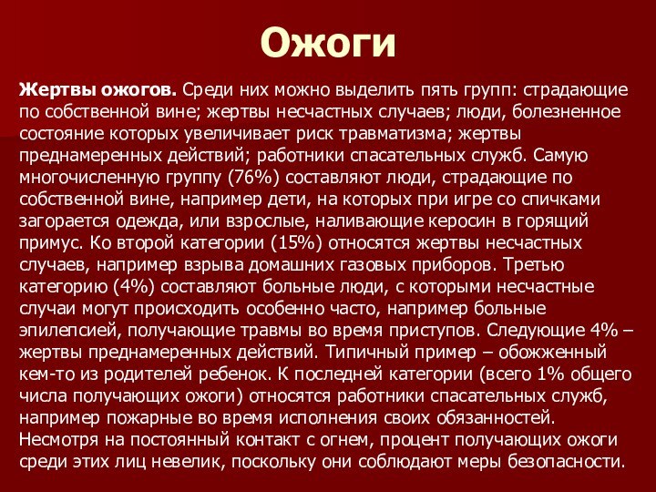 состояние которых увеличивает риск травматизма; жертвы преднамеренных действий; работники спасательных служб. Самую многочисленную группу (76%) составляют люди, страдающие по собственной вине, например дети, на которых при игре со спичками загорается одежда, или взрослые, наливающие керосин в горящий примус. Ко второй категории (15%) относятся жертвы несчастных случаев, например взрыва домашних газовых приборов. Третью категорию (4%) составляют больные люди, с которыми несчастные случаи могут происходить особенно часто, например больные эпилепсией, получающие травмы во время приступов. Следующие 4% – жертвы преднамеренных действий. Типичный пример – обожженный кем-то из родителей ребенок. К последней категории (всего 1% общего числа получающих ожоги) относятся работники спасательных служб, например пожарные во время исполнения своих обязанностей. Несмотря на постоянный контакт с огнем, процент получающих ожоги среди этих лиц невелик, поскольку они соблюдают меры безопасности.