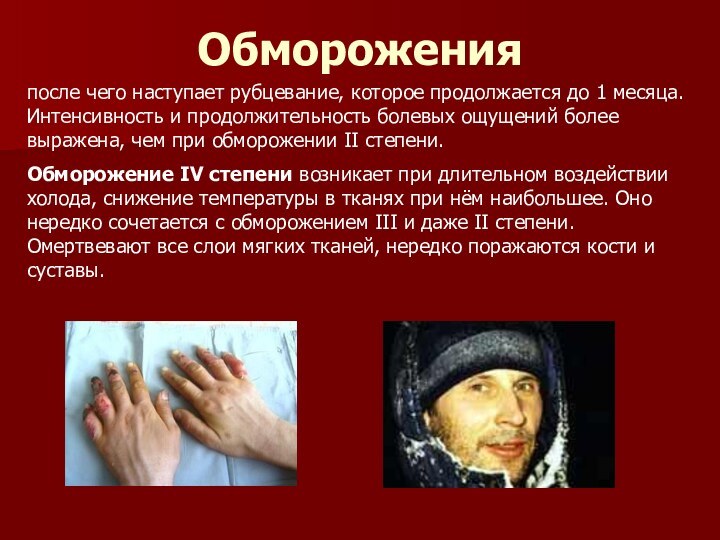 Обморожение IV степени возникает при длительном воздействии холода, снижение температуры в тканях при нём наибольшее. Оно нередко сочетается с обморожением III и даже II степени. Омертвевают все слои мягких тканей, нередко поражаются кости и суставы.