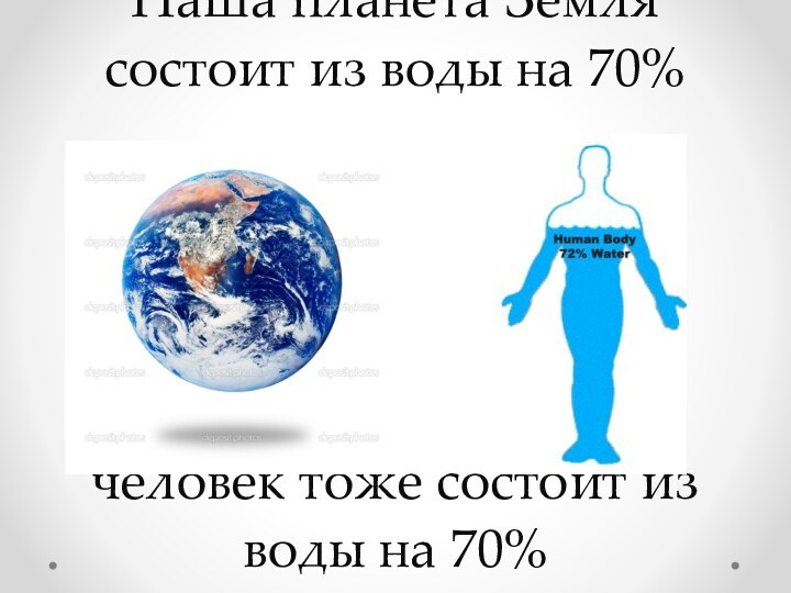 Слайд 3 Наша планета Земля состоит из воды на 70% человек