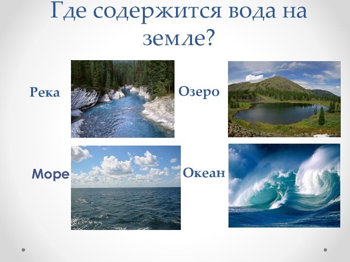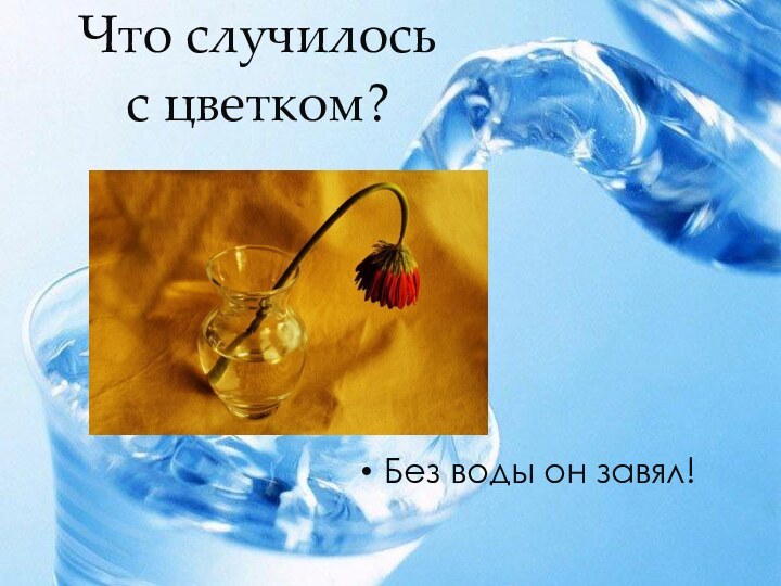 Ах, вода, вода, вода… Что случилось  с цветком?Без воды он завял! Наша планета Земля состоит из воды на 70% Где содержится вода на земле?МореРека Океан Озеро Спасибо за внимание!