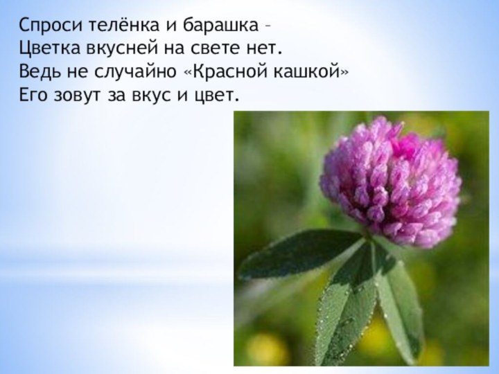 Спроси телёнка и барашка – Цветка вкусней на свете нет. Ведь не случайно «Красной кашкой» Его зовут за вкус и цвет.