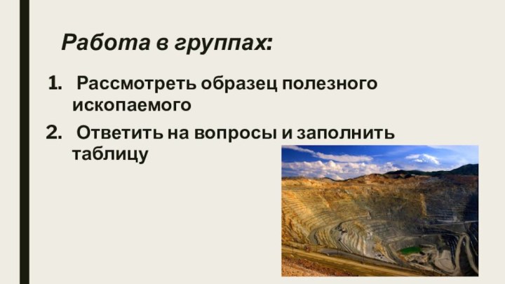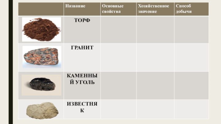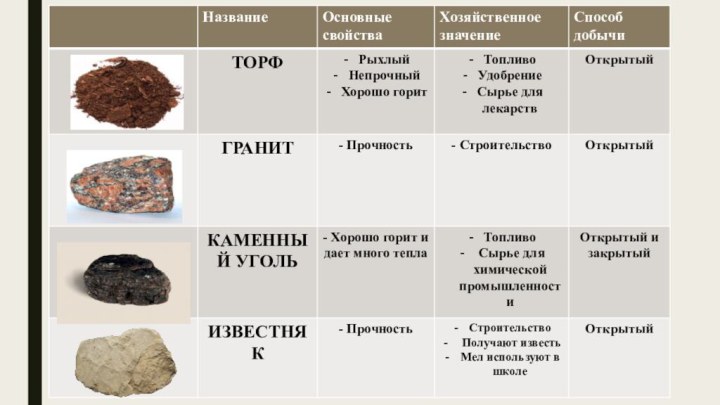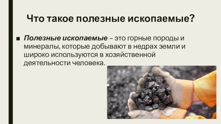 Что такое полезные ископаемые?Полезные ископаемые – это горные породы и минералы, которые добывают в недрах земли и широко используются в хозяйственной деятельности человека.