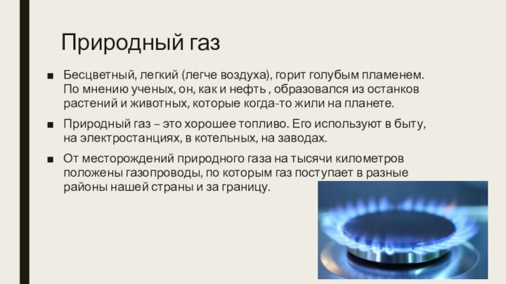 образовался из останков растений и животных, которые когда-то жили на планете. Природный газ – это хорошее топливо. Его используют в быту, на электростанциях, в котельных, на заводах. От месторождений природного газа на тысячи километров положены газопроводы, по которым газ поступает в разные районы нашей страны и за границу.