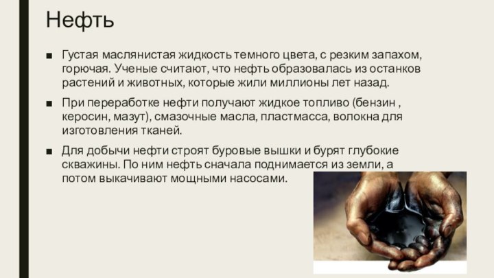растений и животных, которые жили миллионы лет назад. При переработке нефти получают жидкое топливо (бензин , керосин, мазут), смазочные масла, пластмасса, волокна для изготовления тканей. Для добычи нефти строят буровые вышки и бурят глубокие скважины. По ним нефть сначала поднимается из земли, а потом выкачивают мощными насосами.