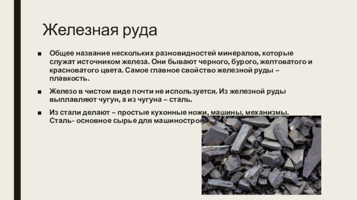 цвета. Самое главное свойство железной руды – плавкость. Железо в чистом виде почти не используется. Из железной руды выплавляют чугун, а из чугуна – сталь. Из стали делают – простые кухонные ножи, машины, механизмы. Сталь- основное сырье для машиностроения.