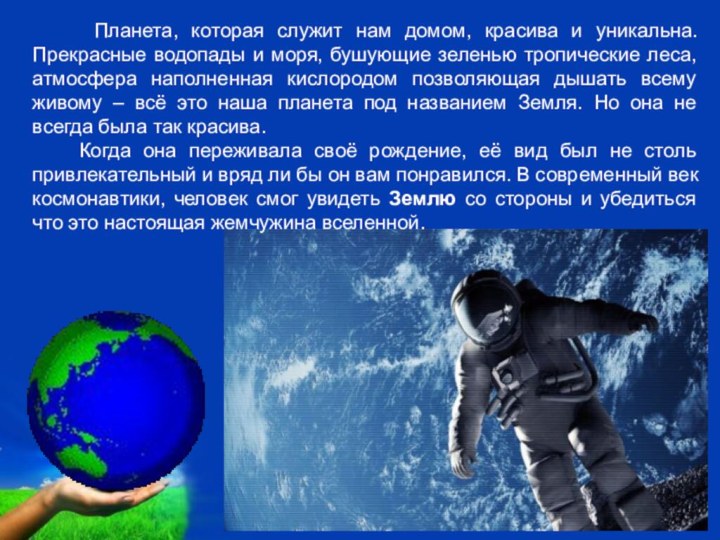 Когда она переживала своё рождение, её вид был не столь привлекательный и вряд ли бы он вам понравился. В современный век космонавтики, человек смог увидеть Землю со стороны и убедиться что это настоящая жемчужина вселенной.