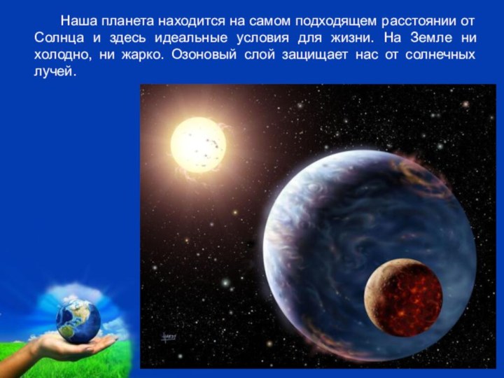 жизни. На Земле ни холодно, ни жарко. Озоновый слой защищает нас от солнечных лучей.