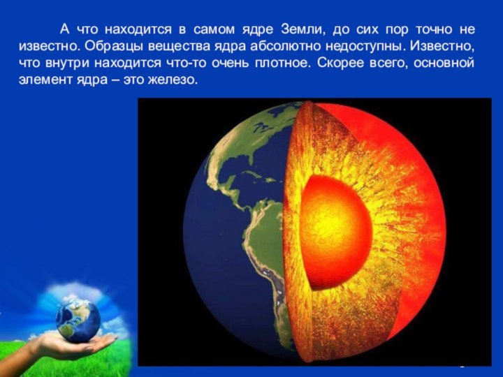 вещества ядра абсолютно недоступны. Известно, что внутри находится что-то очень плотное. Скорее всего, основной элемент ядра – это железо.