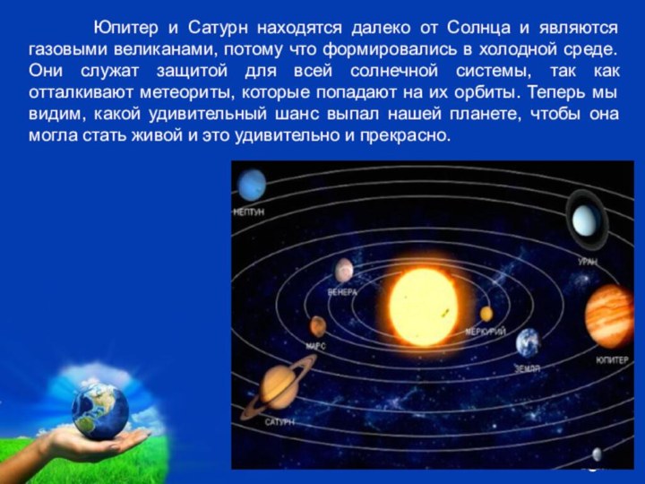 формировались в холодной среде. Они служат защитой для всей солнечной системы, так как отталкивают метеориты, которые попадают на их орбиты. Теперь мы видим, какой удивительный шанс выпал нашей планете, чтобы она могла стать живой и это удивительно и прекрасно.