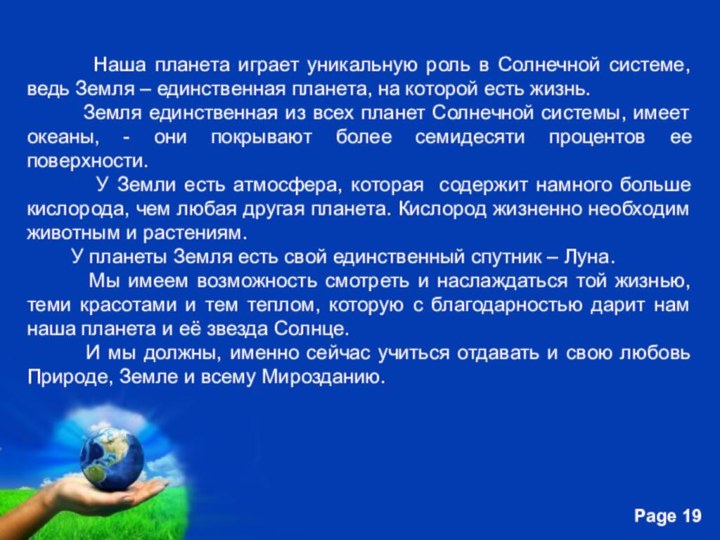 роль в Солнечной системе, ведь Земля – единственная планета,