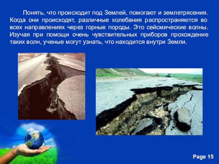 распространяются во всех направлениях через горные породы. Это сейсмические волны. Изучая при помощи очень чувствительных приборов прохождение таких волн, ученые могут узнать, что находится внутри Земли.