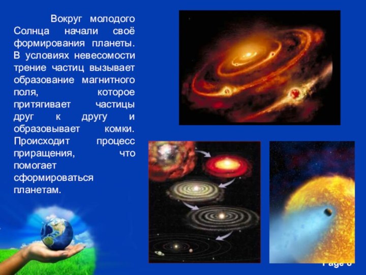 магнитного поля, которое притягивает частицы друг к другу и образовывает комки. Происходит процесс приращения, что помогает сформироваться планетам.