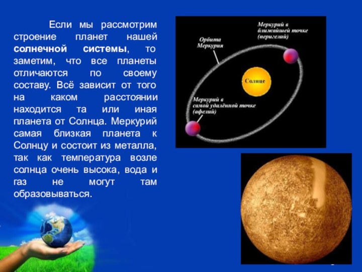 по своему составу. Всё зависит от того на каком расстоянии находится та или иная планета от Солнца. Меркурий самая близкая планета к Солнцу и состоит из металла, так как температура возле солнца очень высока, вода и газ не могут там образовываться.