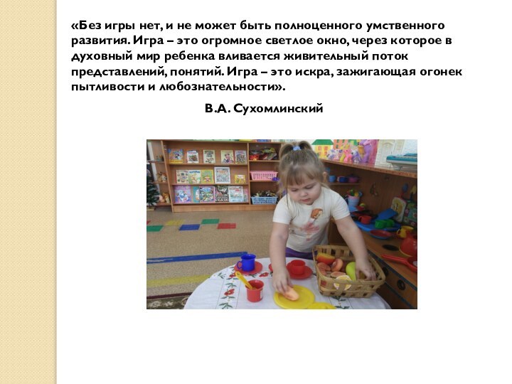 которое в духовный мир ребенка вливается живительный поток представлений, понятий. Игра – это искра, зажигающая огонек пытливости и любознательности».В.А. Сухомлинский