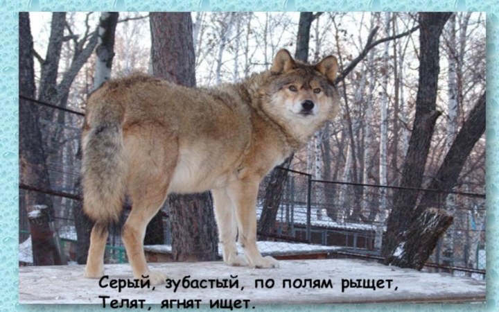 Слайд 8 Серый, зубастый, по полям рыщет, Телят, ягнят ищет.