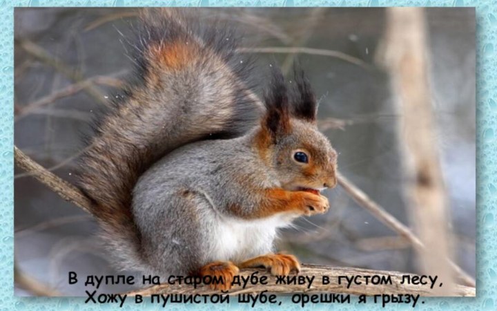 В дупле на старом дубе живу в густом лесу,Хожу в пушистой шубе, орешки я грызу.
