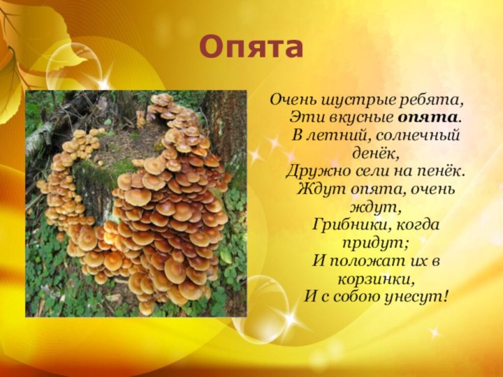 ОпятаОчень шустрые ребята, Эти вкусные опята. В летний, солнечный денёк, Дружно сели