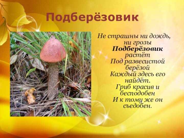 ПодберёзовикНе страшны ни дождь, ни грозы Подберёзовик    растёт Под