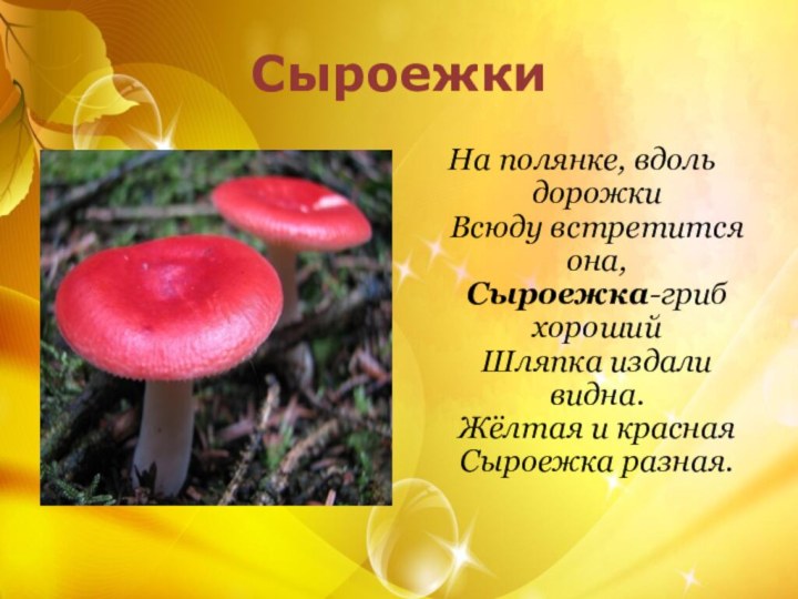 СыроежкиНа полянке, вдоль дорожки Всюду встретится она, Сыроежка-гриб хороший Шляпка издали
