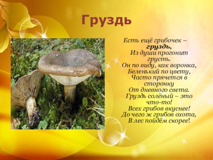 ГруздьЕсть ещё грибочек – груздь, Из души прогонит грусть. Он по