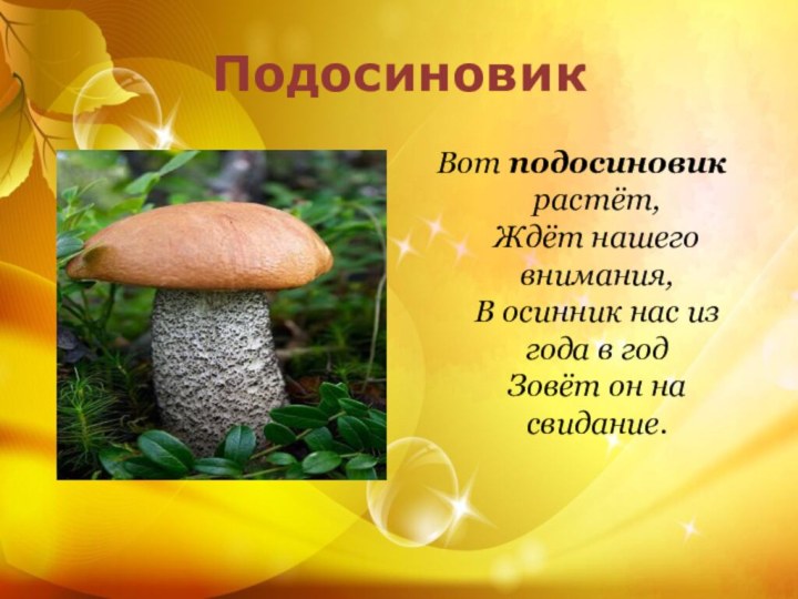 ПодосиновикВот подосиновик растёт, Ждёт нашего внимания, В осинник нас из года