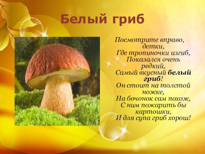 Белый грибПосмотрите вправо, детки, Где тропиночки изгиб, Показался очень редкий, Самый вкусный белый гриб! Он стоит на толстой ножке, На бочонок сам похож, С ним пожарить бы картошки, И для супа гриб хорош!