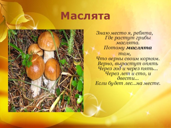 МаслятаЗнаю место я, ребята, Где растут грибы маслята. Потому маслята там, Что верны