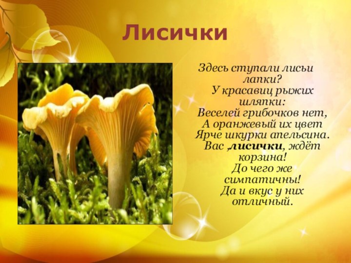 ЛисичкиЗдесь ступали лисьи лапки? У красавиц рыжих шляпки: Веселей грибочков нет,