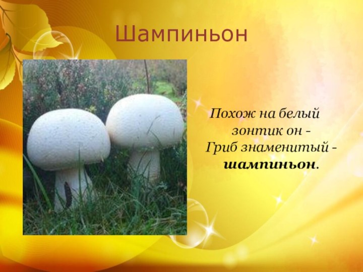 ШампиньонПохож на белый зонтик он -  Гриб знаменитый - шампиньон.